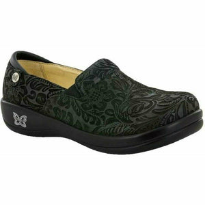 The Alegria Keli PRO Black Emboss Paisley brings a little pizzazz to your basic black loafer. The elastic goring at the instep and padded collar provide an extra comfortable fit. It also features the patented Alegria insoles made of cork, memory foam and leather covered latex. This combination allows the insole to form to your foot creating a custom fit and amazing comfort