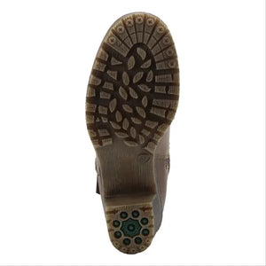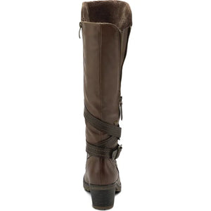 Experience the comfort revolution in this water resistant manmade leather pull-on tall boot featuring a lateral (outside) zipper for an expandable calf and a decorative ankle strap design all on a chunky and sculpted heel.