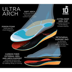 The 10 Seconds 3810 Ultra Arch Support Insoles feature a semi-rigid arch support in addition to a combination arch + metatarsal cushioned pad that runs from the base of the heel all the way through the metatarsals. The result is a heavily cushioned insole that provides firm arch and metatarsal support alongside a deep heel cup and plenty of shock-absorbing padding. For those looking for solid arch support and plenty of cushioning, the Ultra Arch Support insoles are an excellent choice.