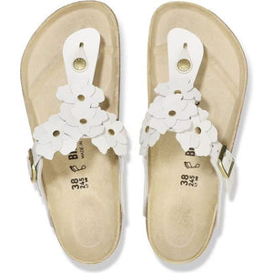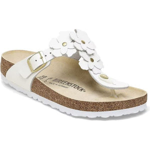 Appliqué flowers make a garden party of this season's Gizeh sandal. Pollinated with gold, especially soft leather sets the scene for cut blooms. The style stays rooted in original BIRKENSTOCK® comfort, with a contoured cork-latex footbed for the ultimate in support.