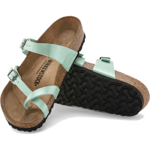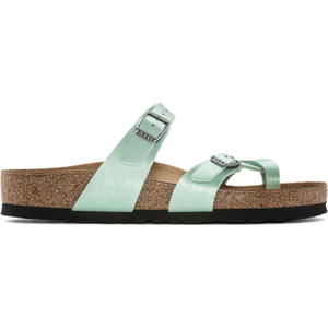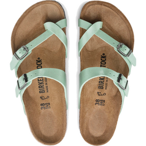 The Mayari from BIRKENSTOCK - an elegantly comfortable sandal with adjustable, crisscrossing straps that form a single loop around the toe. Classic support and adjustability, designed beautifully. This version features a subtle, frosted effect. The upper is made from the skin-friendly, hard-wearing synthetic material Birko-Flor®.