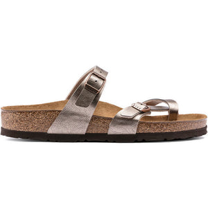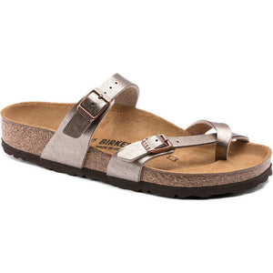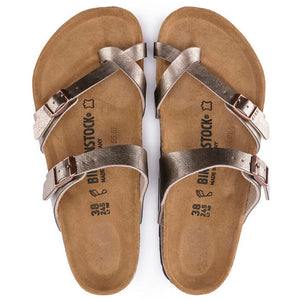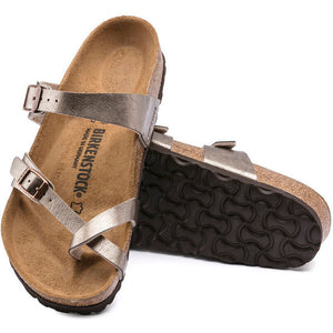 Supremely comfortable with sophisticated, crisscross straps, the Mayari redefines the thong sandal with a single toe loop. A statement finish adds a special sheen to the everyday favorite. Complete with classic BIRKENSTOCK design elements, like adjustable buckle closures and a contoured footbed for the ultimate in support.