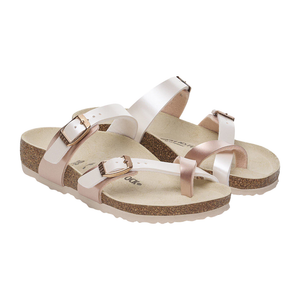 Your favorite sandal, sized down for kids. The Mayari's toe loop crisscrosses over the foot to help keep them comfortable and secure. Designed in their signature Birko-Flor® for a smooth feel that's easy to clean. Complete with an original contoured footbed to support them through days of play.