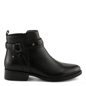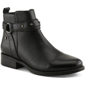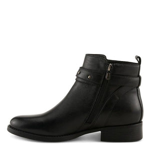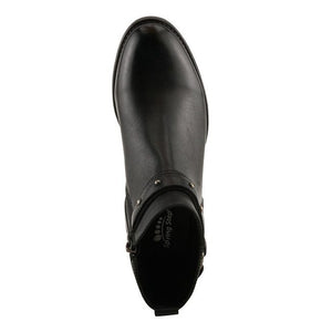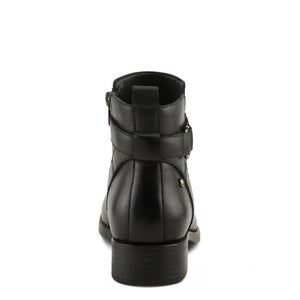 Elevate your look with a sleek and sophisticated bootie crafted from premium leather for a timeless appeal. Featuring a studded belt detail with metallic accents, this bootie adds an edgy yet refined touch to your wardrobe. The front burnishing enhances its rich texture, giving it a subtly worn-in look. Designed for both style and comfort, it sits on a sculpted low heel, providing stability and effortless elegance. Perfect for dressing up or down, this versatile bootie pairs beautifully with jeans, skirts, or dresses for a polished yet modern aesthetic.