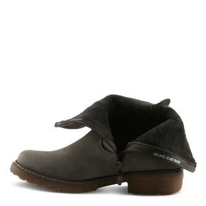 Trendy and functional water resistant mid boot featuring a slouchy shaft design with decorative rope laces at the ankle and a profile zipper with expanding gusset for adjustability.