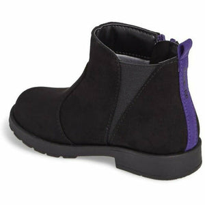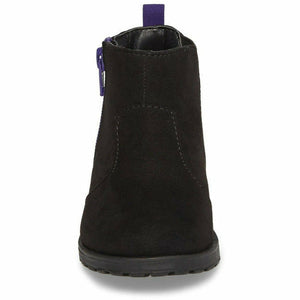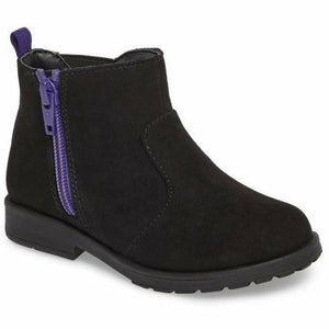 A soft, suede-textured bootie features a full-length zipper on one side of the shaft and a full-length goring panel on the other, for easy on and off with a comfortable fit. The lightly lugged sole helps promote stability and confident early steps for littler feet.