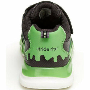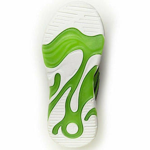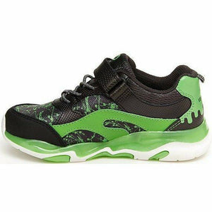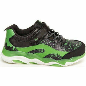 Boy's lighted sneaker with an on and off switch featuring 4 different lighted sequences. Hold ON button for 3 seconds to activate lights. Tap the shoe on the floor to see the lights in action. Change lights by quickly pressing button to reveal next sequence. To turn OFF, hold button for 3 seconds. Features twill linings with anti-microbial treatment, Ortholite® memory foam for enhanced comfort, and adjustable hook and loop closure for easy on-and-off.