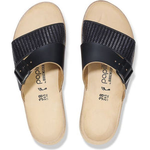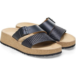 A new wedge from Papillio by BIRKENSTOCK®. The Almina's wide leather straps provide added stability while giving summer-ready raffia the space to stand out. As elevated as it looks, with a contoured footbed for the ultimate in support. Put your comfort above the rest.