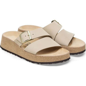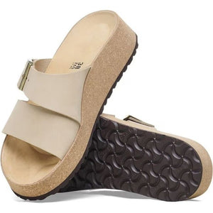 The latest wedge from Papillio® by BIRKENSTOCK®. The Almina's wide leather straps provide added stability while giving your style the space to stand out. Its cork wedge brings classic BIRKENSTOCK® style into the mix, along with a contoured footbed for support that stays above the rest.