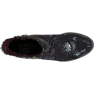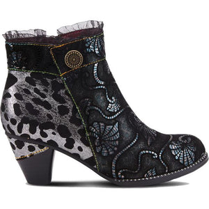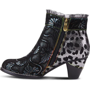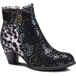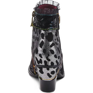 Step out in style and comfort in the perfect bootie for all day and into the night pleasure. Contrasting metallic printed suede kaleidoscope swirls meet colored animal print textile. Taffeta ruffle edged collar, studded welt sole and an inlay animal print stacked cone heel add to the allure. With her softly padded footbed and inside easy on off zipper, Dessa will surely become your favorite go-to style all season long.
