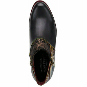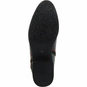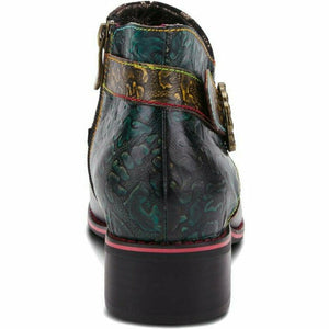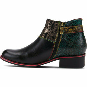 Sexy little side dipped ankle bootie with decorative antique brass rose buckle and inside zipper. The perfect trifecta of premium solid leather, hand painted abstract embossed leather and soft metallic tone on tone ultra suede. A pop of red contrasting welt stitching and outsole with plenty of flex and super padded footbed for all day fashion good looks and into the night continuous comfort.