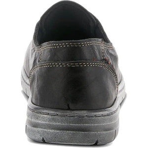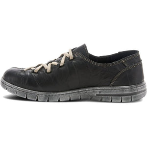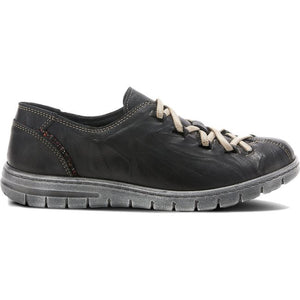 Contemporary high-quality leather sneaker featuring an asymmetrical stitched toe, crinkled leather, and elastic laces on a polyurethane comfort and flexible sole.