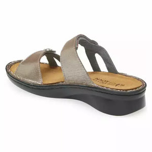 The Triton slide features beautiful floral rhinestone details. This style has two padded hook & loop straps making it fully adjustable. Naot's removable, anatomic cork & latex footbed is wrapped in pampering suede and molds to the shape of the foot with wear. The Allegro Collection features a 1.5" polyurethane sole which is extremely lightweight and durable.