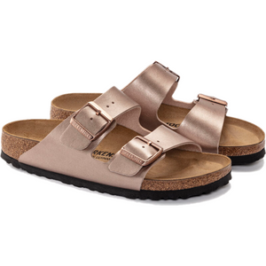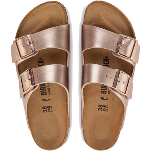 An icon of timeless design and legendary comfort, the Arizona sandal has been defining style since 1973. An electric gold finish transforms the classic look into your favorite be-seen pair, outfitted with tonal buckles to elevate the look. Complete with classic BIRKENSTOCK design elements, like a contoured cork-latex footbed for the ultimate in support.