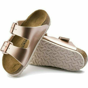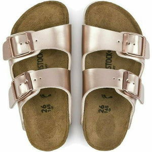 The BIRKENSTOCK Arizona is a genuine classic that has been delighting wearers with its timeless design for decades. The two-strap model fits kids’ feet perfectly – even during boisterous play! This sandal was reinterpreted in an extravagant electric metallic look. The reflective film makes this classic model dazzle and is sure to make any outfit turn heads. The color-coordinated outsole and the buckles round off the shoe’s look of sophistication. The upper is made from the skin-friendly, hard-wearing synthetic material Birko-Flor®.