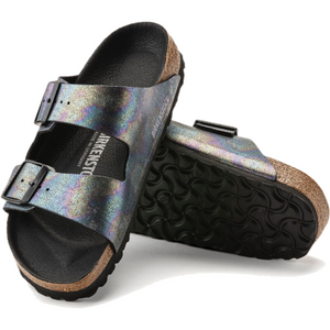 The BIRKENSTOCK Arizona is a genuine classic that has been delighting both men and women with its timeless design for decades. This version features an iridescent, silky sheen and sparkles in all colors of the rainbow. The color-coordinated details round off the shoe’s look of sophistication. The upper is made from skin-friendly microfiber.