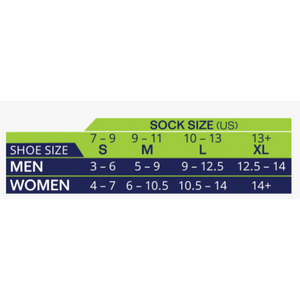 These mild (8-15 mmHg) graduated compression over the calf (OTC) socks are great for workout recovery or help get you through the workday by improving circulation and reducing fatigue and swelling. We recommend a larger size if your foot is between sizes to reduce the chance of premature wear.