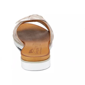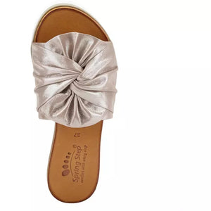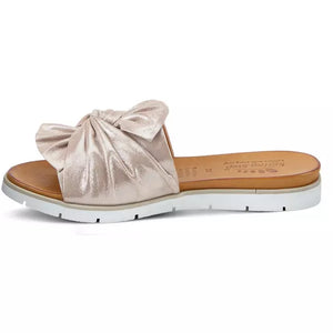 Slip on style with this beautiful slide sandal with a leather bow twist detail. In a rainbow of colors and a flexible outsole for comfort, this is your go-to slide for the season. Small V-goring located underneath the bow allows for additional adjustability. Plus everything your foot touches is leather.