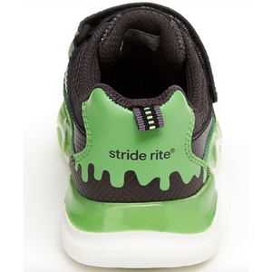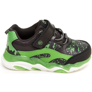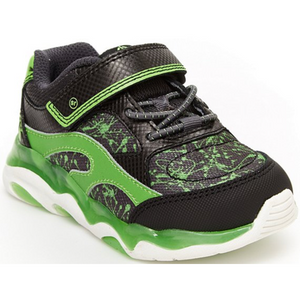 Boy's lighted sneaker with an on and off switch featuring 4 different lighted sequences. Hold ON button for 3 seconds to activate lights. Tap the shoe on the floor to see the lights in action. Change lights by quickly pressing button to reveal next sequence. To turn OFF, hold button for 3 seconds. Features twill linings with anti-microbial treatment, Ortholite® memory foam for enhanced comfort, and adjustable hook and loop closure for easy on-and-off.