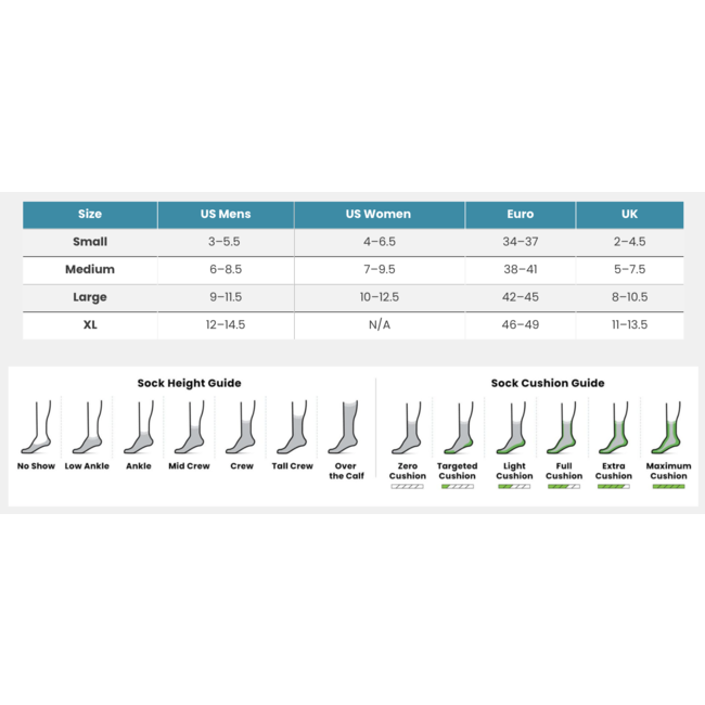 Medium Cushion: Medium thickness, full-sock cushion for heavier loads and higher-volume footwear