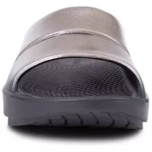 The OOahh Luxe Slide features revolutionary OOfoam™ technology that absorbs 37% more impact than traditional footwear foam materials to reduce the stress on your feet and joints. This technology aids in the recovery process and creates an incredibly comfortable sandal you can wear anywhere. The Luxe treatment features hand-painted details that are unique to this OOahh style.