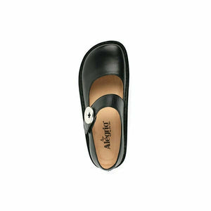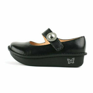 Classy, classy, classy...and one of the most loved products on Alegria Shoe Shop! The popular Paloma Black Napa,offers a smooth black leather upper and silver accent stitching. This shoe really is a staple in the closet of every Alegria fan! The Alegria Paloma Black Napa features a simple silver side button covering a single velcro strap piece for amazing adjustability to accommodate even the most problematic feet. The unparalleledcomfort of the Black Napa mary jane shoe comes from many unique features such as: