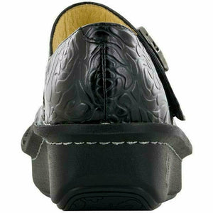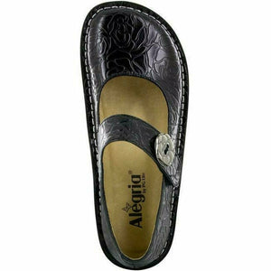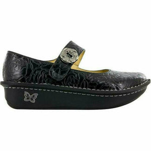The Alegria Paloma Black Embossed Rose is one of Alegria Shoe Shop's most asked for! This Paloma is work friendly and casual appropriate. You can't go wrong! The Alegria Paloma Black Embossed Rose is a polished black leather with floral embossing etched in the napa leather.This Alegria Paloma also features silver stitching and a silver floral side button to conceal a velcro closure strap allowing for greater adjustability. The unparalleled comfort of the Alegria Paloma PRO Feathers mary jane shoe comes from many unique features such as: