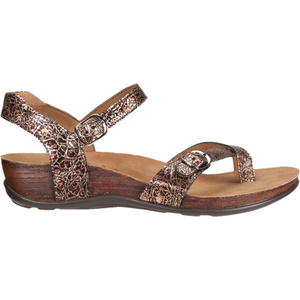 This beautiful sandal features genuine leather straps and a wood grain patterned base that's sure to turn heads. A soft contoured insole covered in Super Suede supports the natural arch of the foot, and a flexible sole rebounds with each step. The fit of this sandal is customizable with two adjustable buckles.