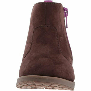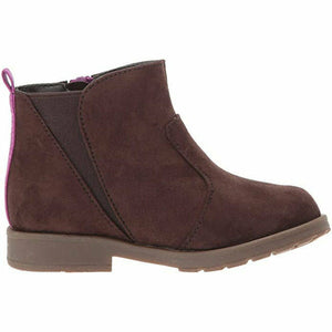 A soft, suede-textured bootie features a full-length zipper on one side of the shaft and a full-length goring panel on the other, for easy on and off with a comfortable fit. The lightly lugged sole helps promote stability and confident early steps for littler feet.