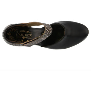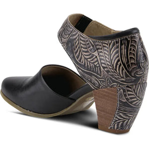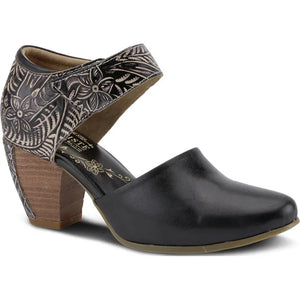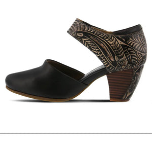 French-inspired, hand-made d'orsay, Mary Jane style, detailed in hand-painted and tooled leather all on a matching tooled leather-wrapped heel.